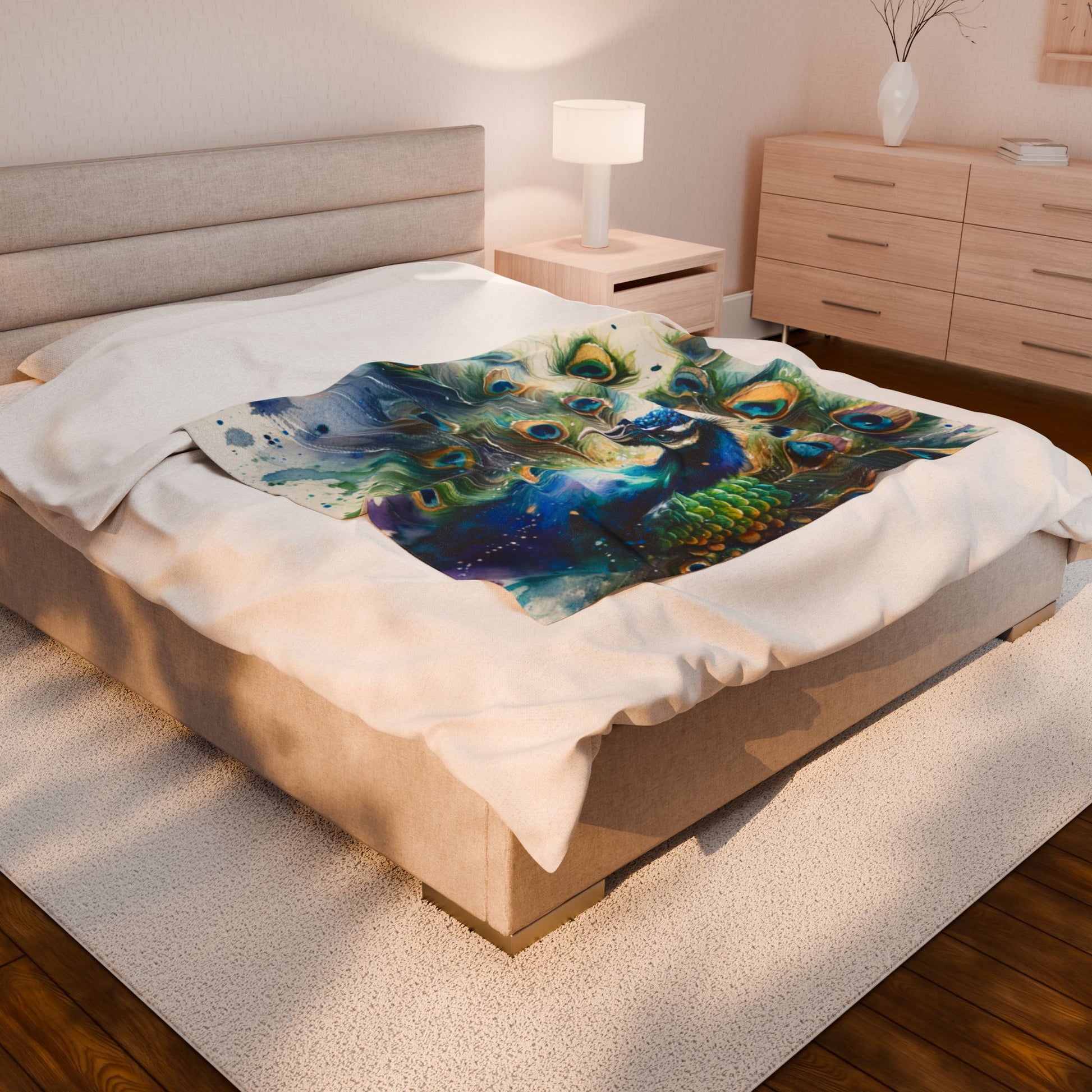 Transform your living space with this stunning Velvet Plush Blanket. With a vibrant peacock design, it adds a splash of color and a touch of elegance to any room. Cozy up on chilly nights or use it as a decorative throw on your sofa. Perfect for those who appreciate artistry and comfort, this blanket is ideal for homebodies, art lovers, or anyone looking to elevate their decor. Great for gifting on occasions such as housewarmings, birthdays, or holidays. Wrap yourself in warmth and beauty, making every moment special with this luxurious blanket.