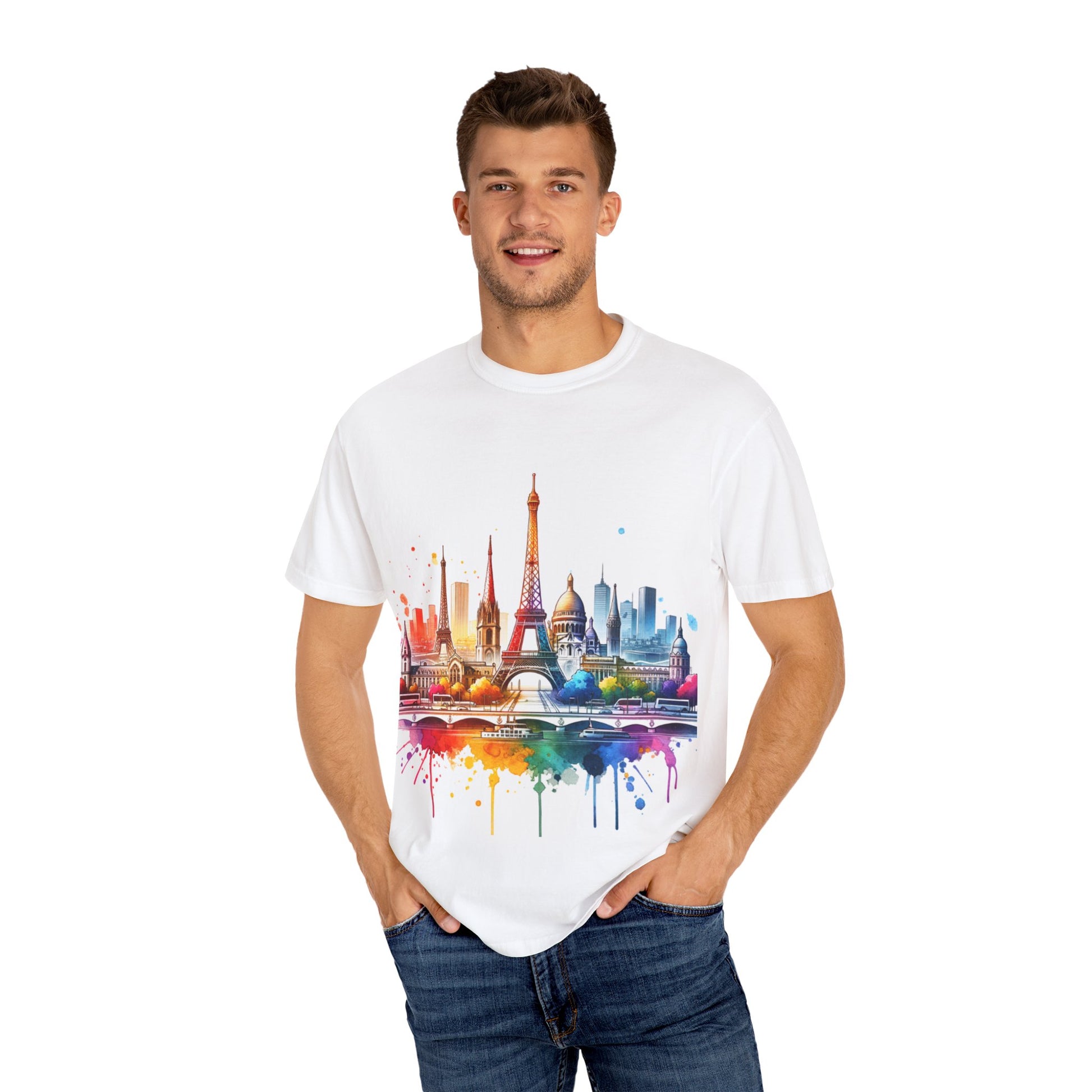 Introducing a vibrant Unisex Garment-Dyed T-shirt that brings a splash of color to your wardrobe. This eye-catching tee features a stunning design inspired by iconic city skylines, making it perfect for urban explorers and travel enthusiasts. Its soft, garment-dyed fabric offers a unique texture and stylish vibe, perfect for casual outings, weekend adventures, or even relaxed office days.